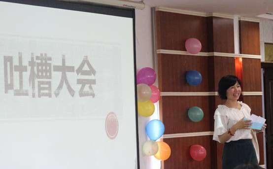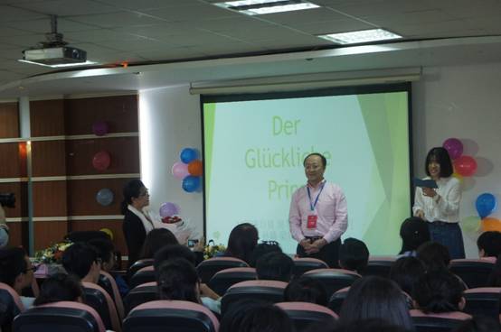 像系庆这么重要的场合,绝对是吐槽最好的时机啦,李红云老师为我们主持了一场别开生面的吐槽大会。吐槽的对象既有德语系的老师们,还有让我们又爱又恨的德语。而我们的主持人李老师一上场便吐槽了赵洪彦老师那让人羡慕的嗓音,直接拿出里尔克《Herbst》一诗的纸稿,请赵老师为大家表演了一段精彩的无彩排朗诵。而不管是哲哲小仙女还是外教Stephan也都无法幸免。外教Stephan被吐槽最多的竟然是他那无论冬夏都不会换掉的黑色衣服!