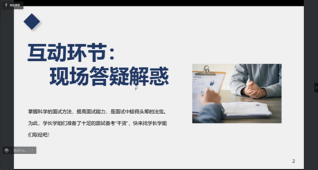 为了提高同学们对面试的认识,掌握科学面试方法,提高面试能力,伟德国际victor1946于 4月23日成功举办了面试经验分享会。学长学姐们将经验倾囊相授,为同学们提供了十足的面试“干货”;虽然因为疫情无法面对面进行交流,但同学们热情洋溢,求知若渴,积极地参与线上互动。大家都摩拳擦掌,干劲十足,为未来的面试养精蓄锐。
