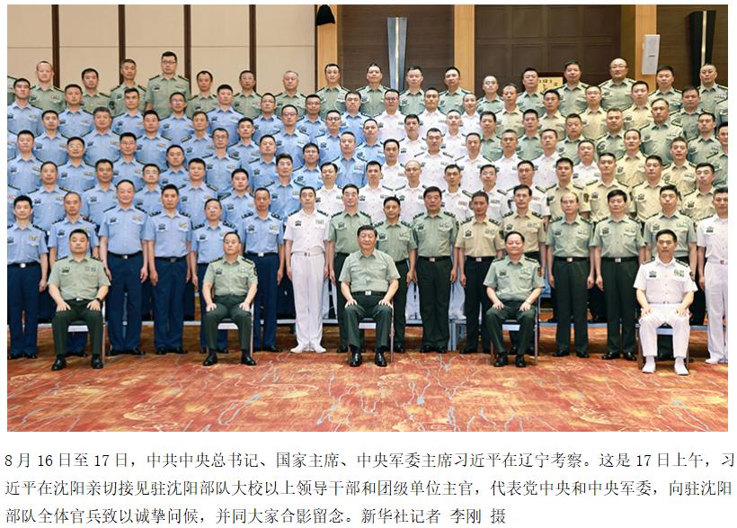 8月17日上午,习近平在沈阳亲切接见驻沈阳部队大校以上领导干部和团级单位主官,代表党中央和中央军委,向驻沈阳部队全体官兵致以诚挚问候,并同大家合影留念。张又侠陪同接见。