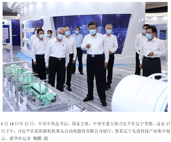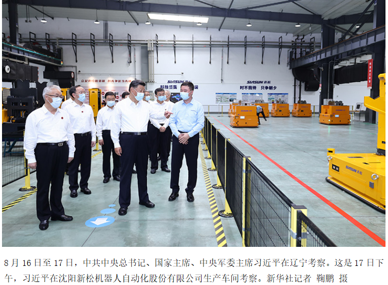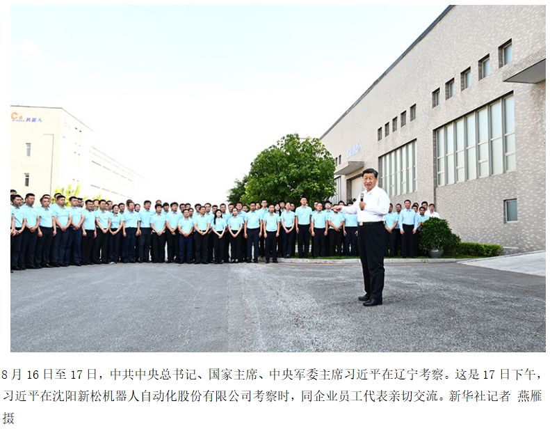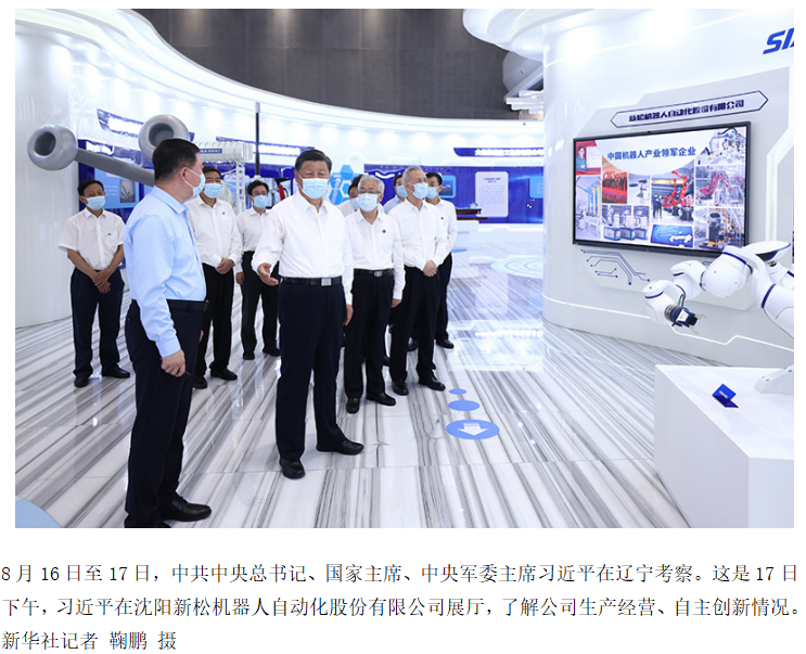 习近平17日在沈阳市考察调研。当天下午,他来到沈阳新松机器人自动化股份有限公司。在企业展厅,习近平听取辽宁新时代东北振兴整体情况介绍,察看辽宁先进科技产品集中展示,并考察了新松公司生产经营、自主创新情况。企业生产车间内,工业机器人、协作机器人、特种机器人等正在进行测试。习近平向技术人员和企业职工询问企业开展核心技术攻关等情况,对企业自主创新和产业化发展取得的成绩予以肯定,表示新松公司体现了中国速度、中国水平。
